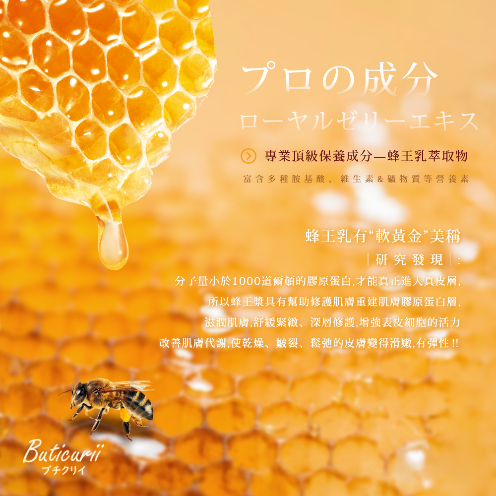 而蜂王漿具有幫助修護肌膚重建肌膚膠原蛋白層,滋潤肌膚,