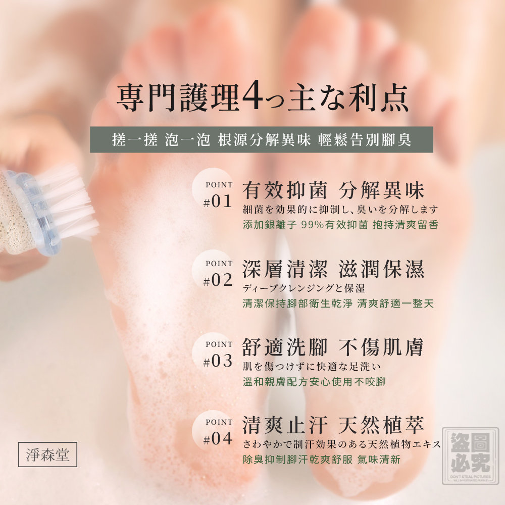 一般的沐浴乳,無法去除足部的異味,因為腳上有身體沒有的黴菌,所以要使用專門為腳準備的沐浴乳。