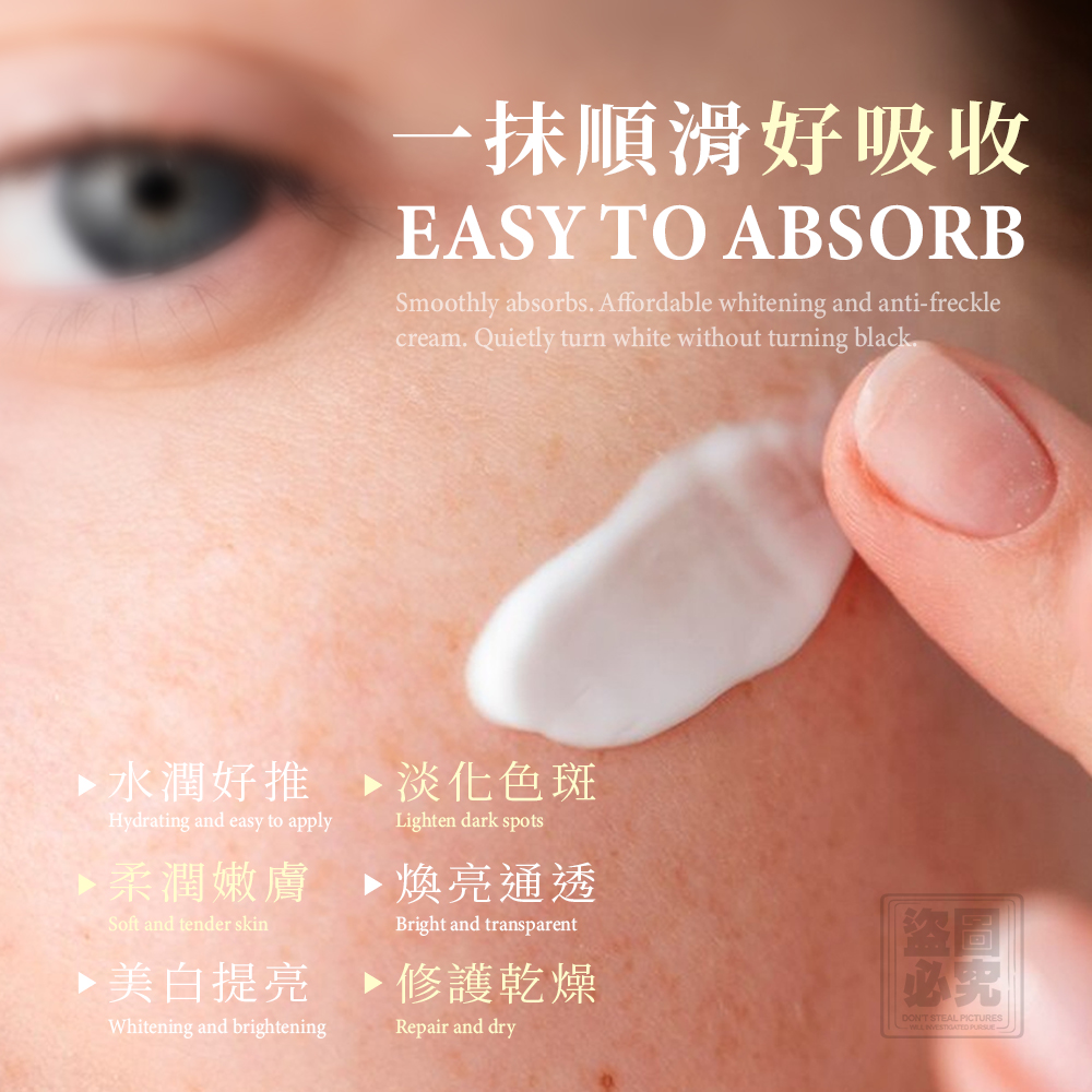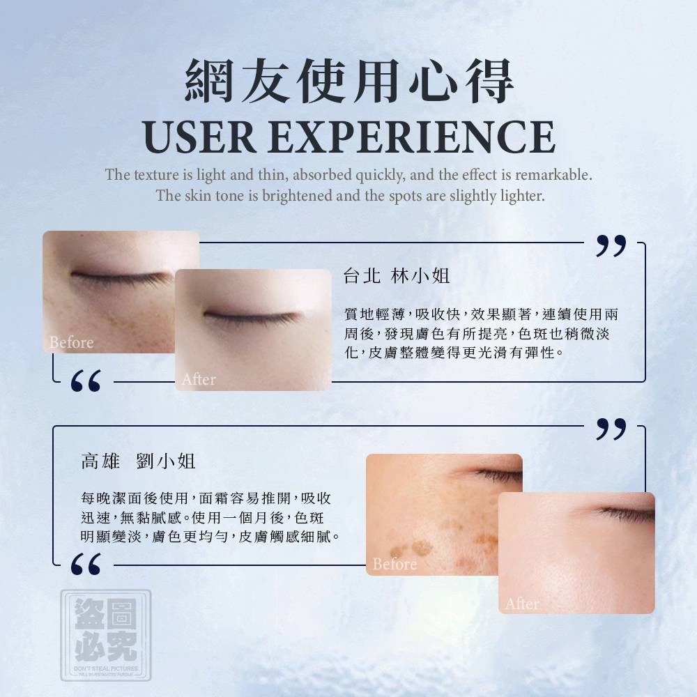 使用方法:洗完臉,化妝水精華液後,取適量,均勻抹於全臉,也可以針對局部斑點處,點式按壓加強,直至吸收。