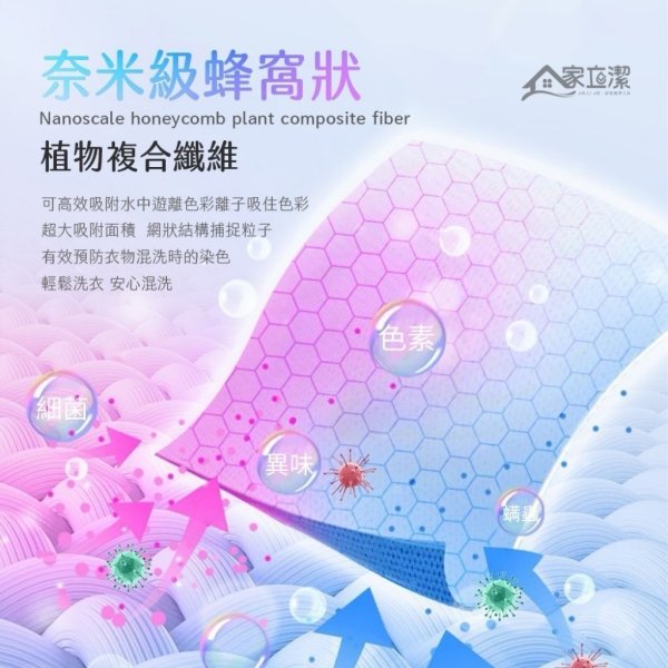 奈米級蜂窩狀植物纖維,迅速吸附色彩離子,預防染色,守護衣物本色!🔰