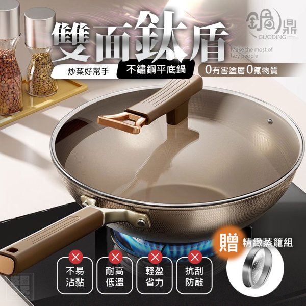 🔥鍋鼎 雙面鈦盾不鏽鋼平底鍋加贈蒸籠