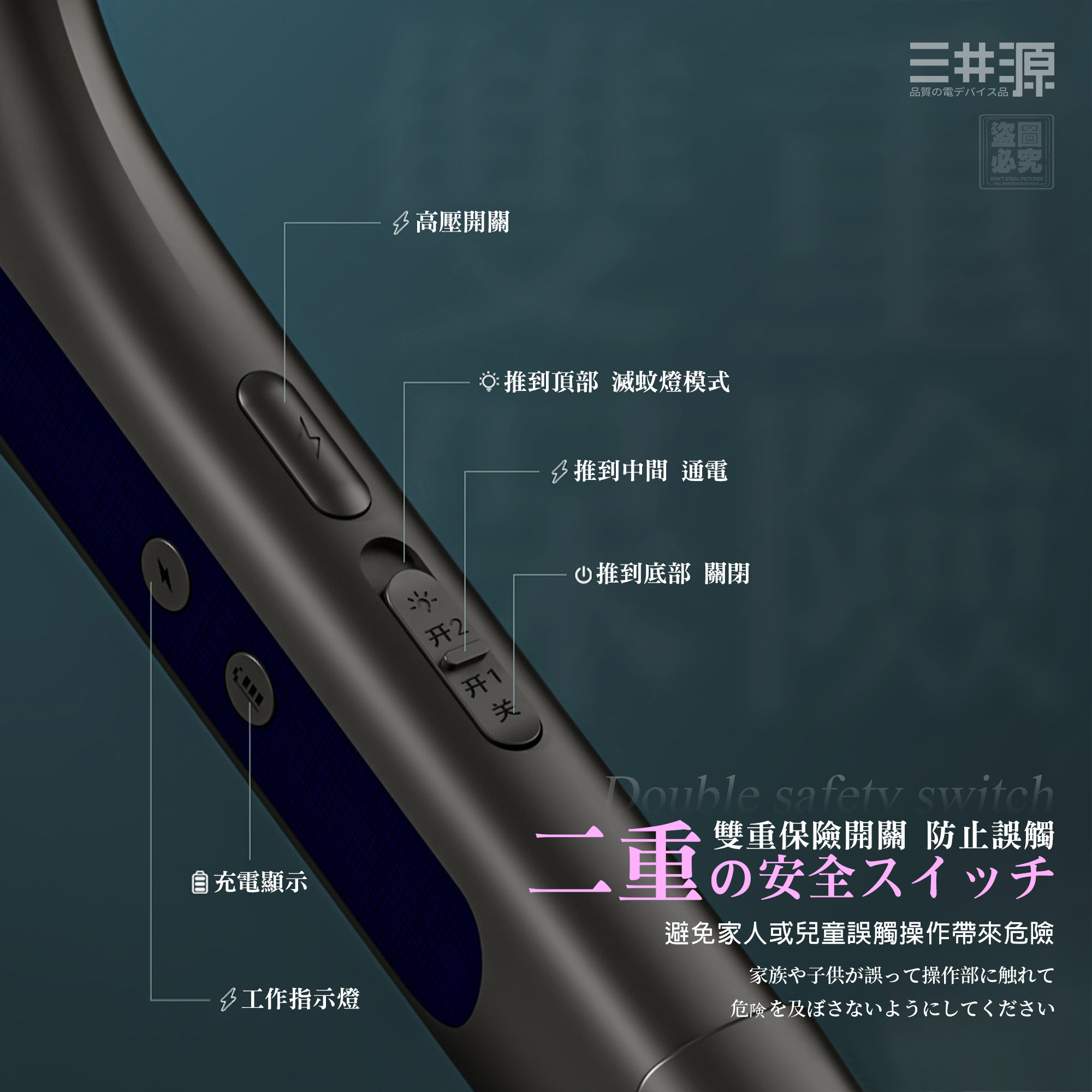 2800V高壓瞬間滅蚊,蚊蟲無法逃脫。雙重保險開關,防止誤觸,兒童安全無憂。前後絕緣保護網,只電蚊蟲不電人,使用更安心。自動消除餘電,關機後無殘留電流,避免誤觸。