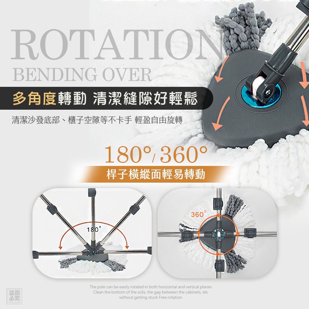 • 180°橫向+360°縱向旋轉拖頭|沙發底、櫃子縫隙也能靈活清潔