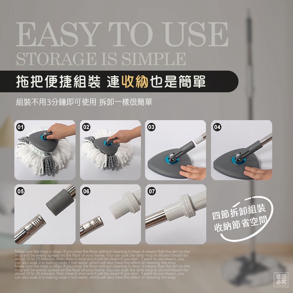 • 四節可拆卸拖把桿|組裝/拆收超快速,方便不占空間