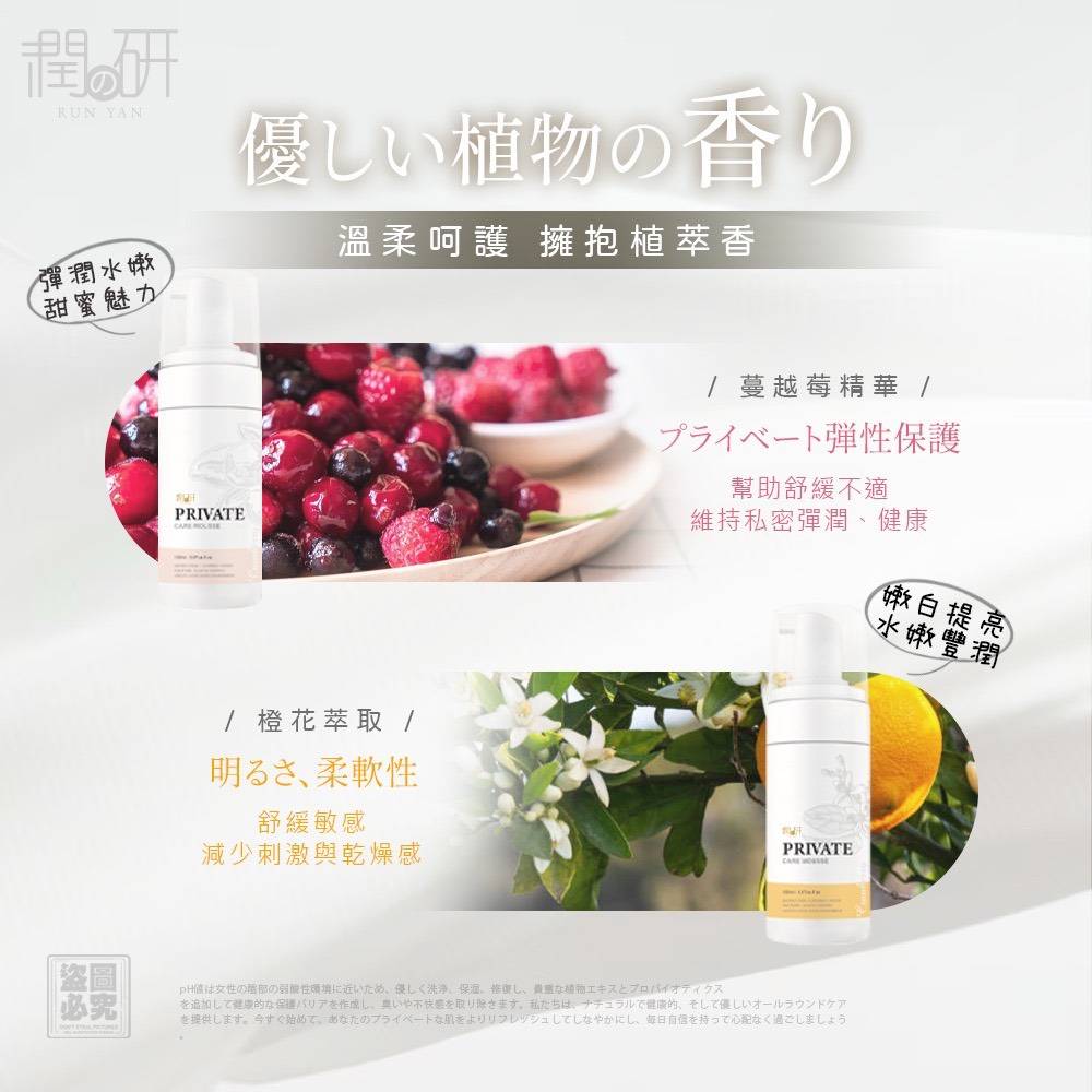 潤妍私密潔浴慕斯選用貼近私密肌膚酸鹼值的 pH3.5–4.5 弱酸性配方,溫和清潔,維持每日私密處的舒適與清新感受。