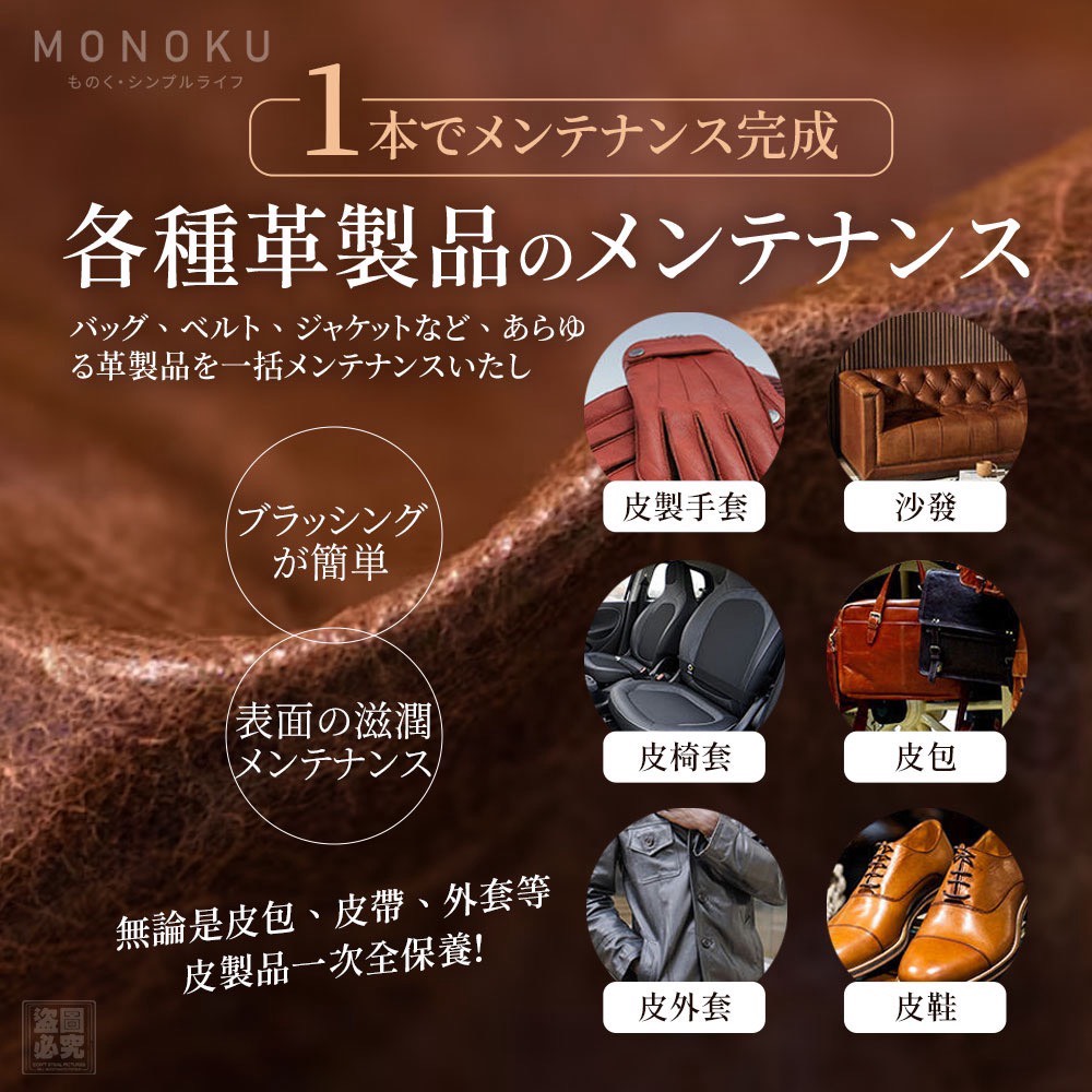 皮包、皮鞋、皮沙發、皮衣、方向盤…一瓶就能全方位呵護,讓皮革維持彈性、柔亮、防裂紋!