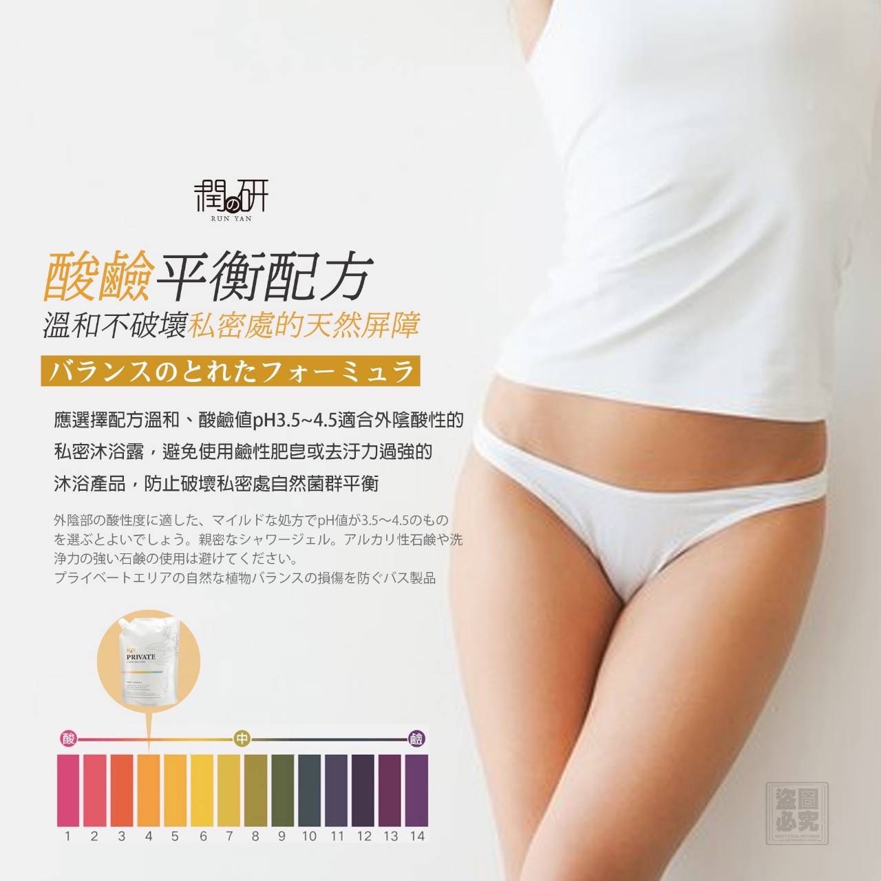 女性私密處PH值需維持在3.8 - 4.5, 維持弱酸性可預防感染、搔癢及異味。
