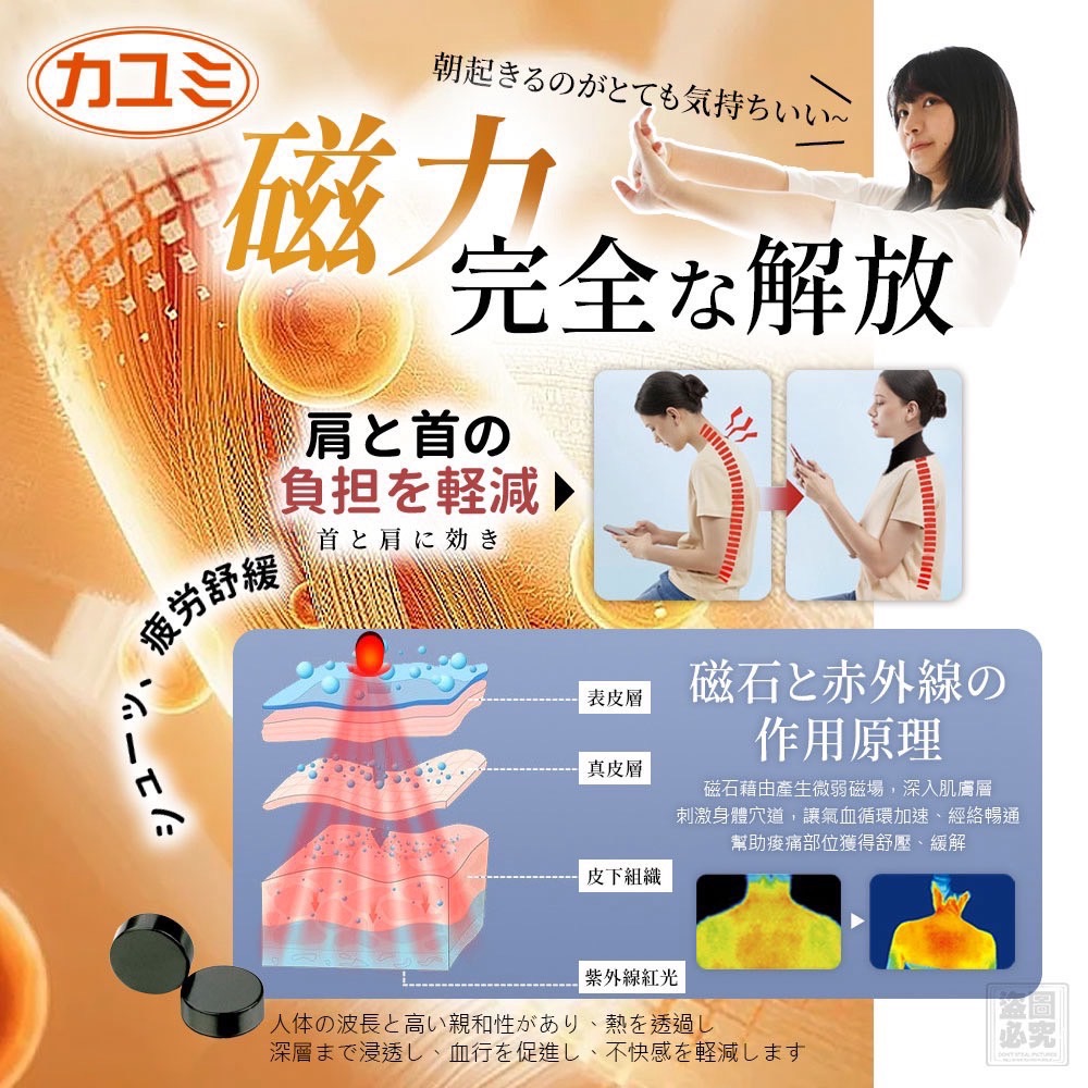 這款來自日本熱銷的「カユミ磁力遠紅肩頸套」運用磁力循環設計與遠紅外熱感科技,幫助肩頸放鬆,緩解緊繃壓力,讓你白天輕鬆活動、夜晚更好入睡。