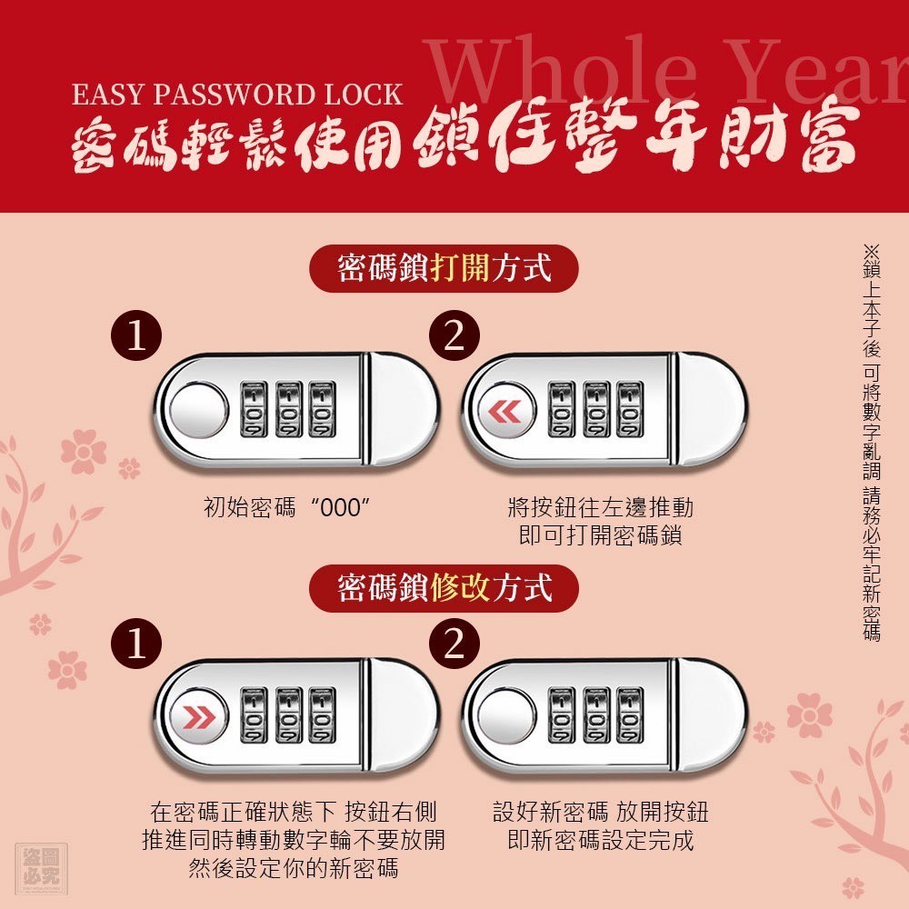 轉動數字輪設定新密碼,鬆開按鈕即完成!
