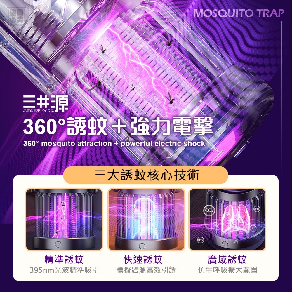 💎 360°全方位強力電擊|三大誘蚊技術