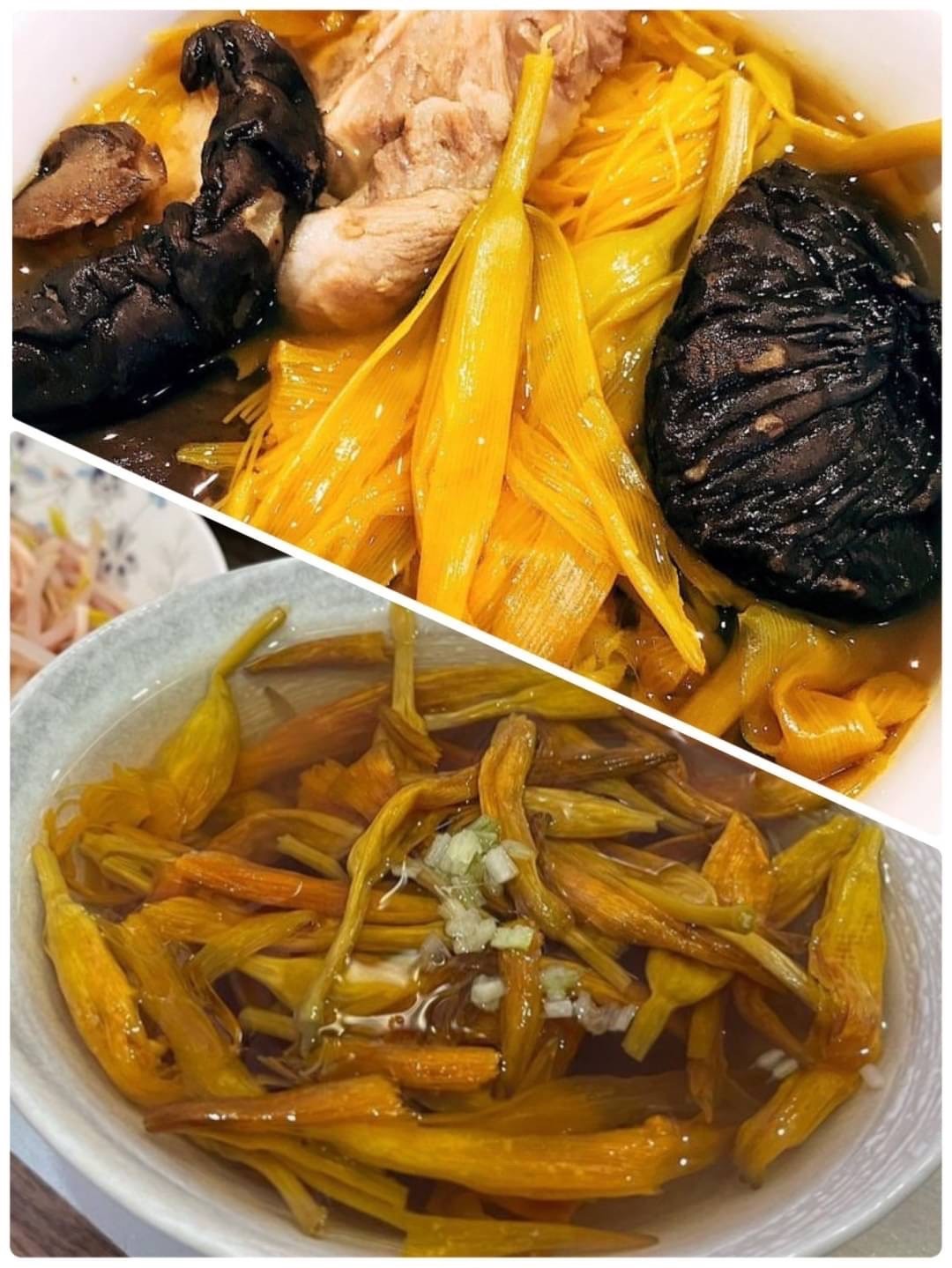 🍲煮湯~水煮開,放入金針花、木耳絲、薑絲等,適量調味,起鍋前加入少許香油,是道清爽可口湯品。