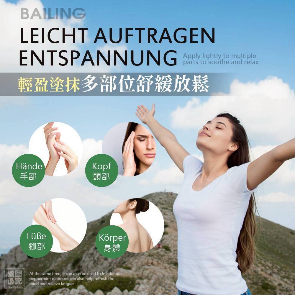 來自德國原料研發的百靈薄荷精油霜,質地清爽、氣味舒適,日常外出、辦公、活動後塗抹超放鬆!
