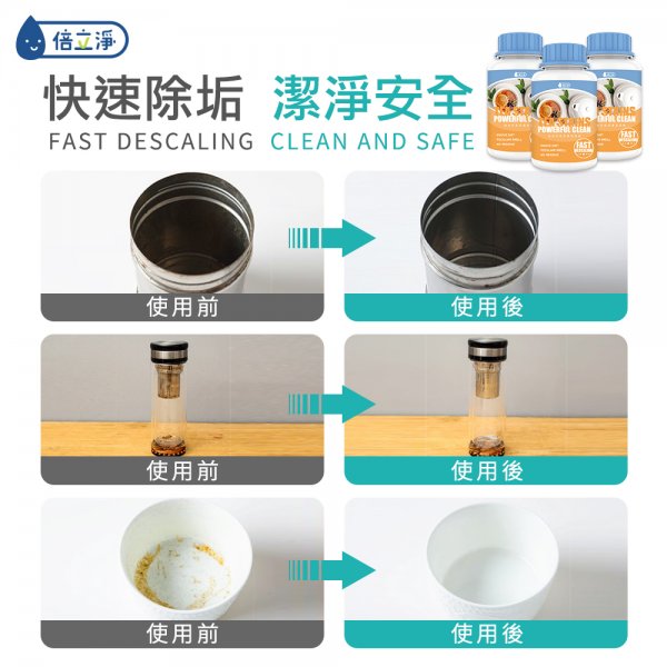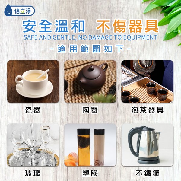 將清潔劑倒入瓶蓋的量,接著倒入要清潔的容器,再加入溫水蓋過茶垢範圍,浸泡待茶垢溶解掉,使用清水沖洗並且擦拭乾淨即可。
