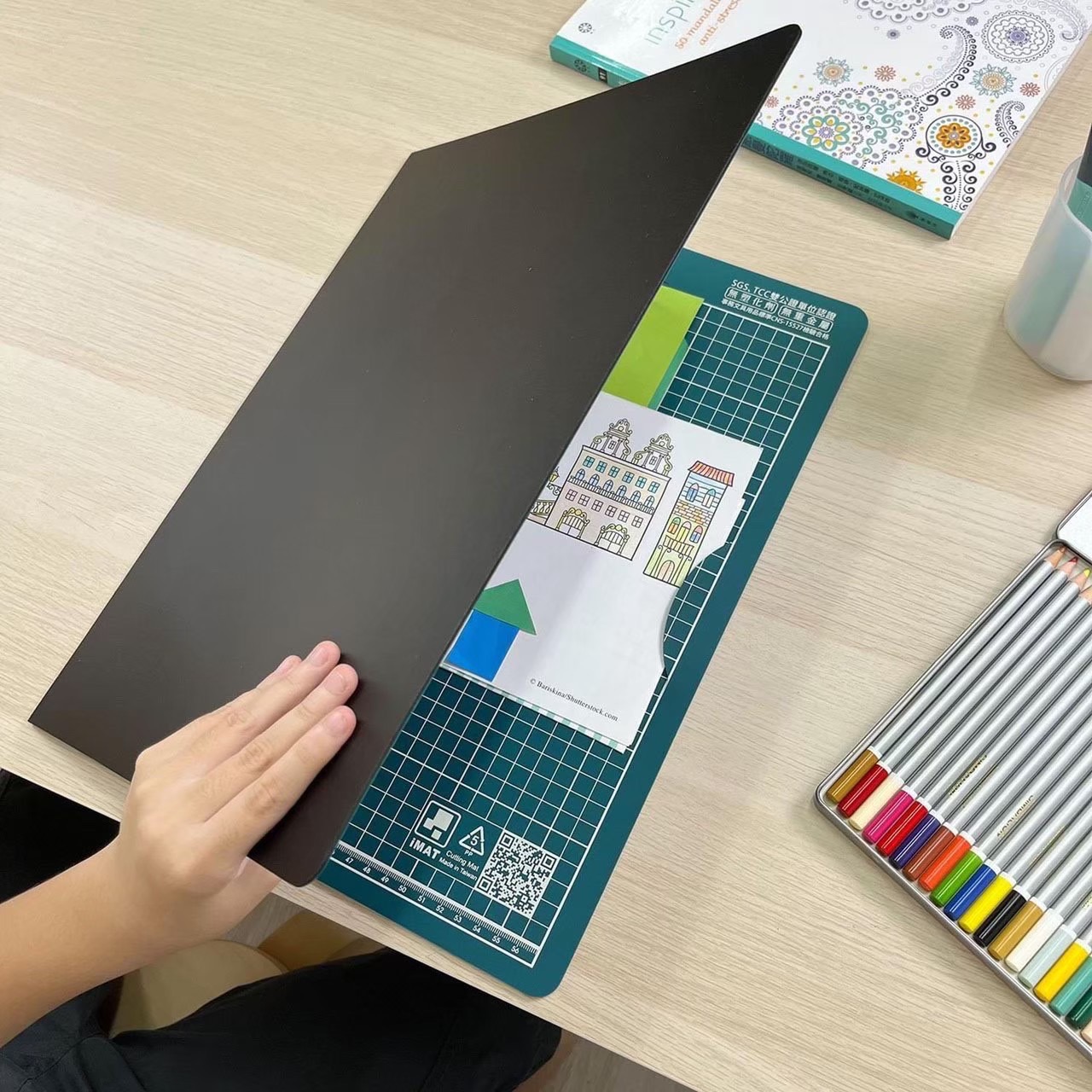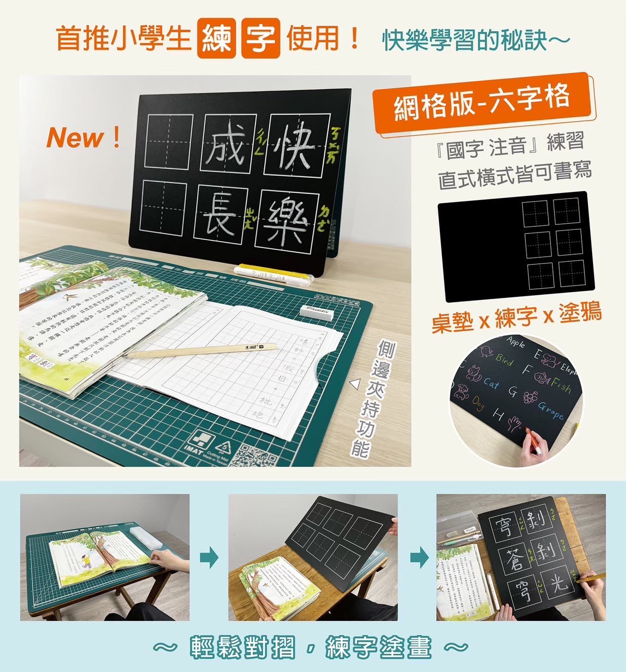 『iMAT 摺疊夾持學生切割塗鴉桌墊』是一款雙面應用的育教桌墊,也是家長的得力小幫手!正面除了一般桌墊及切割墊功能,背面還是互動教學黑板,搭配水溶性蠟筆塗寫畫畫;採用環保無毒材質,使用超安心,擁有2項獨家專利,一項摺疊功能「大面積使用,小面積攜帶」,無論去上學、安親班或是在家裡都能方便攜帶,同時滿足您有足夠的空間平台能夠使用,另一項則是新型夾持功能「紙張收納及夾持固定」,正面夾持 可以將紙張、筆記、考卷…等集中收納外,背面夾持 則可以當立架展示作品。