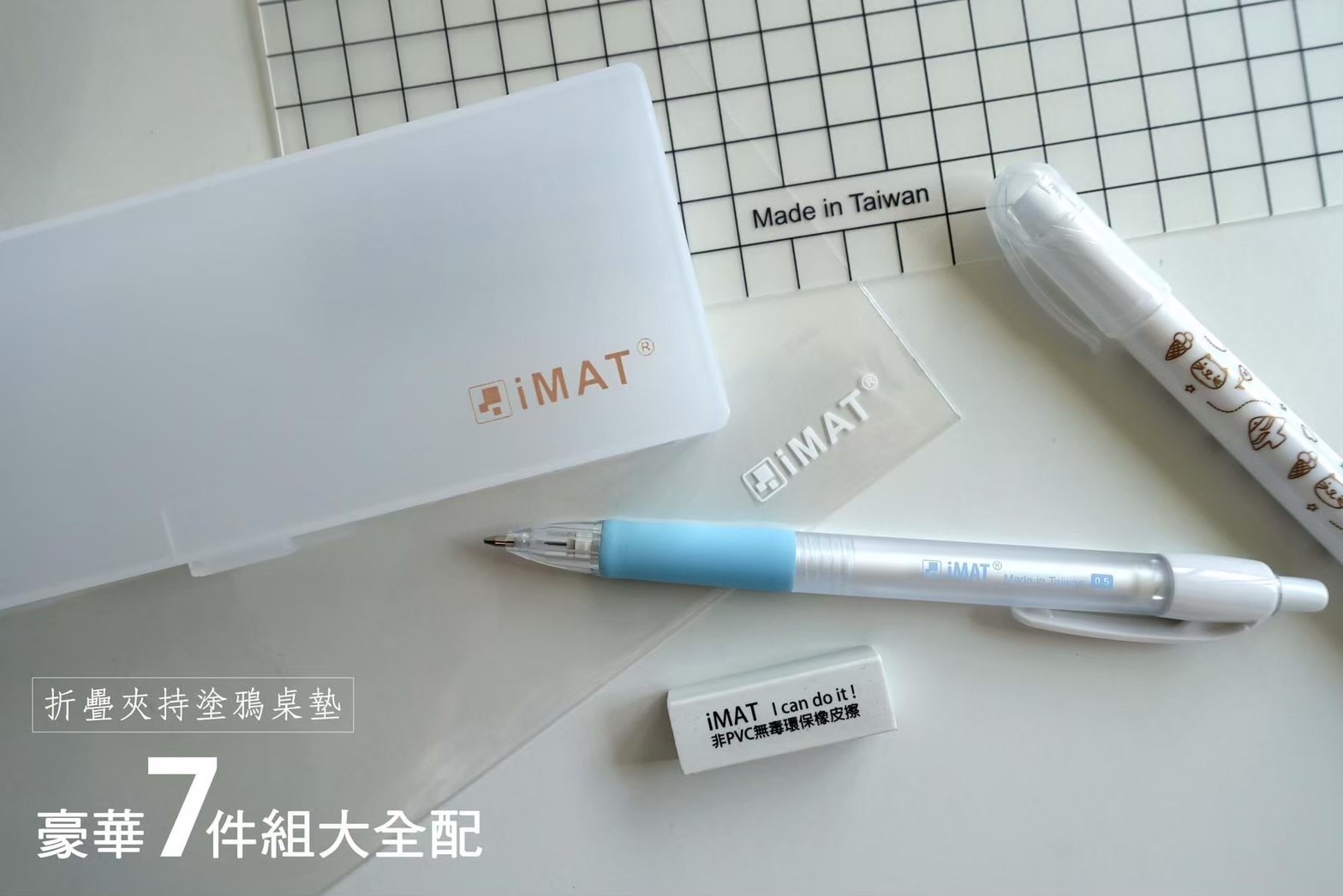 3.iMAT 安全環保無毒文具套組 x 1組→ 內含 A4 透明夾鏈袋、A4墊板、馬卡龍自動鉛筆、橡皮擦 ,各1只(顏色隨機出貨)