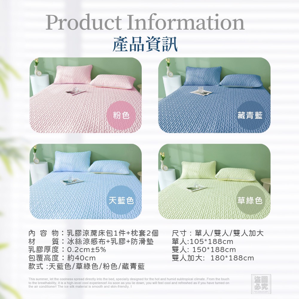 ✔️內容物:乳膠涼蓆床包1件+枕套2個